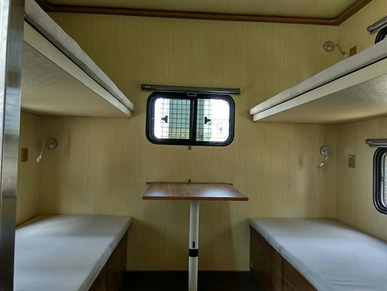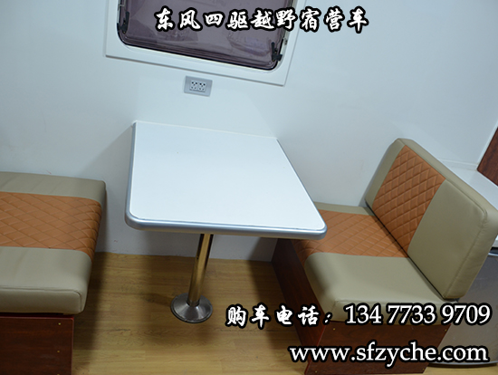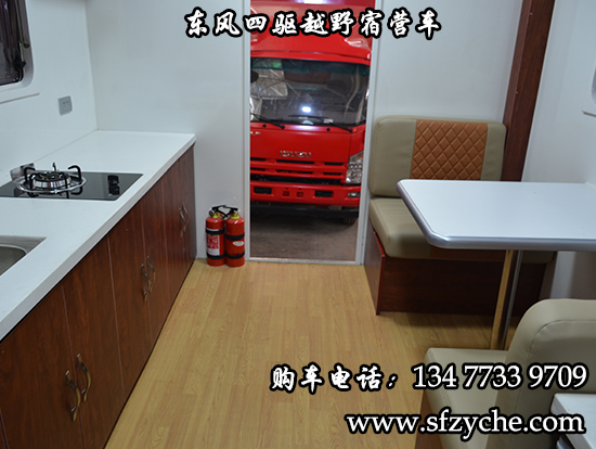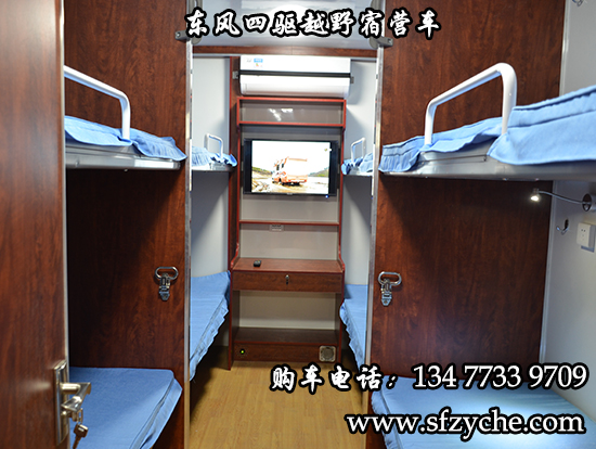 東風(fēng)大型四驅(qū)越野房車滿足更多路況復(fù)雜環(huán)境使用,廂體內(nèi)裝有豪華折疊床、液晶電視、儲(chǔ)物柜、應(yīng)急燈、頂燈、頂置空調(diào)、床墊、被褥、燃油加熱器、頂護(hù)欄、爬梯、隱藏抽拉梯、專用房車門、中空玻璃、戶外燈。由保溫廂體、空氣調(diào)節(jié)系統(tǒng)、宿營(yíng)設(shè)施、影音系統(tǒng)、電氣系統(tǒng)、通風(fēng)換氣系統(tǒng)、洗漱和衛(wèi)生設(shè)施。整個(gè)廂體分為三個(gè)部分,住宿區(qū)、洗漱區(qū)、餐飲區(qū)。住宿區(qū)包括四個(gè)上下鋪,床頭燈,液晶電視,空調(diào)等。洗浴區(qū)包括臉臺(tái),衛(wèi)生間,熱水器等。餐飲區(qū)包括無煙灶臺(tái),可活動(dòng)餐桌,洗菜盆等。也可以根據(jù)用戶的需要設(shè)計(jì),可增加會(huì)議室,辦公區(qū)等。東風(fēng)大型四驅(qū)越野房車內(nèi)飾圖片: