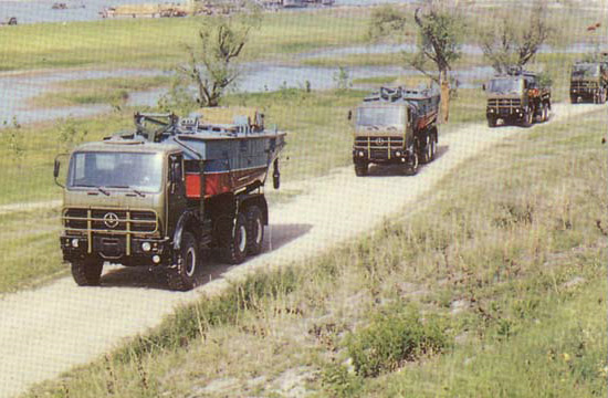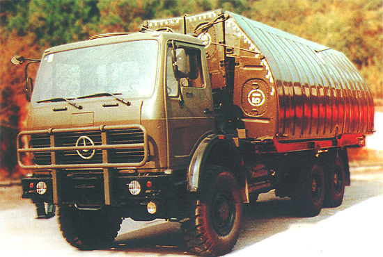 鐵馬XC2200重載卡車(chē)在1980年后期進(jìn)入PLA服役,主要用于運(yùn)輸重型工程設(shè)備和武器系統(tǒng)。中國(guó)鐵馬(Tiema) XC2200重載卡車(chē)由西南汽車(chē)廠(chǎng)(現(xiàn)在北方- 奔馳卡車(chē)公司分部)制造,位于重慶(Chongqing)市?ㄜ(chē)以德國(guó)梅賽德斯-奔馳2060型卡車(chē)為基礎(chǔ)。目前卡車(chē)在PLA服役中,被當(dāng)做重型工程設(shè)備卡車(chē)和武器系統(tǒng)車(chē)底盤(pán)。PLA在1970年后期訂購(gòu)了少量的德國(guó)梅賽德斯-奔馳2026型重載卡車(chē)(8噸的容量,6X6)補(bǔ)充它不足的重載卡車(chē)。這些卡車(chē)主要地用于重型火炮拖車(chē)任務(wù)。PLA對(duì)車(chē)輛的性能印象深刻,并且接洽梅賽德斯- 奔馳公司去得到許可在中國(guó)聯(lián)合生產(chǎn)卡車(chē)。鐵馬XC2200(最初即是TM-SC2030)的發(fā)展,梅賽德斯- 奔馳2060型的一個(gè)中國(guó)仿造型,從1980年早期開(kāi)始。 西南汽車(chē)廠(chǎng),一個(gè)中國(guó)北方工業(yè)總公司(NORINCO)位于重慶(Chongqing)市的下屬公司,被選擇當(dāng)做主承包商。1982年看到了原型的介紹。稍后在1985年中國(guó)從西德引進(jìn)了ZF機(jī)械變速箱和KHD413風(fēng)冷柴油發(fā)動(dòng)機(jī)技術(shù),兩者在鐵馬XC2200卡車(chē)上被采用。XC2200批量生產(chǎn)在1986年開(kāi)始,每年從生產(chǎn)線(xiàn)上生產(chǎn)2,000輛。大多數(shù)的這些車(chē)輛被PLA接收用于重貨物/設(shè)備運(yùn)輸、火炮拖車(chē)和武器系統(tǒng)車(chē)底盤(pán)。車(chē)輛包括在西藏高地、戈壁沙漠和中國(guó)最?lèi)毫拥牡缆泛吞鞖鉅顩r區(qū)域展示了優(yōu)良性能和可靠性。除了被PLA部署,車(chē)輛也被輸出到巴基斯坦、泰國(guó)、印尼和斯里蘭卡。XC2200采用雙車(chē)門(mén)正向控制駕駛室,位于發(fā)動(dòng)機(jī)艙上面。駕駛室有四個(gè)座位和在頂板有一個(gè)天窗。后面的貨物車(chē)身的后擋板和側(cè)擋板可放下,可拆卸蓬架和帆布蓬。單預(yù)備輪被垂直地安裝在乘員室后面,靠近載貨車(chē)箱在駕駛室和后貨物車(chē)體之間。這一個(gè)空間能用來(lái)容納一個(gè)修理工具箱和其它的裝載/卸貨設(shè)備。與第一代中國(guó)自行生產(chǎn)的重型臺(tái)車(chē)相比較,XC2200有好很多的通用性能,連同85公里/小時(shí)的最大道路速度和一個(gè)8噸的越野裝載能力。ZF5S-110/111 GPA變速箱有九個(gè)前進(jìn)檔和一個(gè)倒車(chē)檔。三個(gè)車(chē)軸和六個(gè)車(chē)輪全部運(yùn)行使用速度差速器鎖定裝置,即使當(dāng)車(chē)輛的一側(cè)上一個(gè)或更多的車(chē)輪沒(méi)有與地面接觸中,或已經(jīng)失去牽引,確保車(chē)輛持續(xù)驅(qū)動(dòng)。除了基本的貨物卡車(chē)改型之外,XC2200也可得到許多其它的改型, 包括4X4、8X8、長(zhǎng)軸距貨車(chē)、起重機(jī)、掩護(hù)所、架橋車(chē)、運(yùn)船車(chē)、道路鋪設(shè)車(chē)和多種武器系統(tǒng)車(chē)底盤(pán)。中國(guó)也已經(jīng)發(fā)展基于XC2200設(shè)計(jì)的WZ551輪式裝甲人員輸送車(chē)(APC)。鐵馬XC2200浮橋架橋卡車(chē)。鐵馬XC2200用于WS-1多管火箭發(fā)射裝置車(chē)底盤(pán)。鐵馬XC2200用于運(yùn)船車(chē)。
