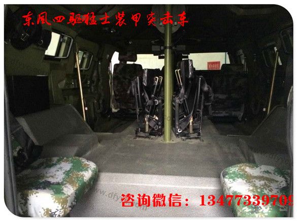 猛士裝甲內(nèi)飾:同樣受保密制度限制,沒(méi)有第一時(shí)間得到猛士裝甲版內(nèi)飾照片,與猛士基礎(chǔ)車型相仿,因?yàn)橹兄靡,車?nèi)中央通道前部被發(fā)動(dòng)機(jī)所占據(jù),后排座的中央通道形成一個(gè)平臺(tái),可放置貨品或?yàn)檐図斘淦骰咎峁┤藛T操作平臺(tái)。請(qǐng)注意上下兩幅圖的猛士裝甲版車門內(nèi)側(cè)特寫的不同。