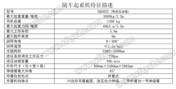 凈功率206kw; 起重機(jī)型號(hào)為:SQ302Z(帶液壓油箱),起重機(jī)質(zhì)量為:1200kg,最大額定超升載荷為:3000kg. 側(cè)防護(hù)金屬材料Q235斷面槽形,螺栓連接,斷面高度40mm,離地高度450mm; 后防護(hù)金屬材料Q235斷面槽形,螺栓連接,斷面高度135mm,離地高度500mm; 安裝具有衛(wèi)星定位功能行駛記錄儀,東風(fēng)越野隨車吊:www.117685.com 吊機(jī)詳細(xì)參數(shù):